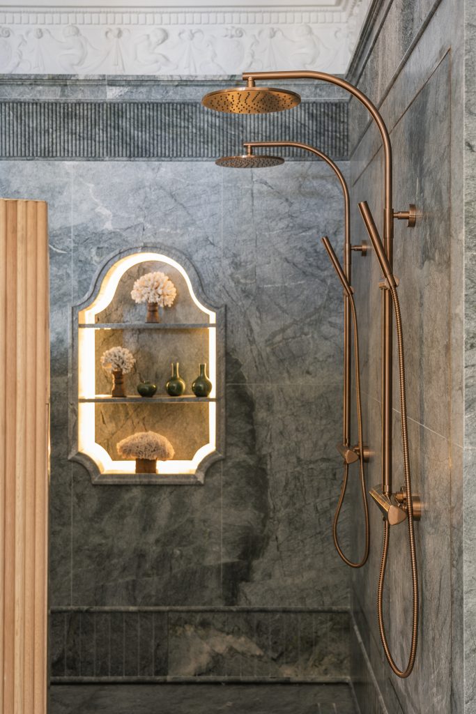 Este majestuoso espacio de baño se divide en dos estancias. La primera de ellas cuenta como protagonista con un biombo curvo forrado en madera que marca la distribución del espacio. En el interior encontramos la columna de ducha termostática Ítaca en bronce, de la colección Metallics, que se caracteriza por su diseño de líneas sencillas y elegantes. El interior de la ducha va forrado en granito en tono verde agua que imita al mármol y al que le da la bienvenida un escalón del mismo material, con el que se consigue ofrecer una sensación de bienestar que nos transporta al origen mediterráneo de la marca.