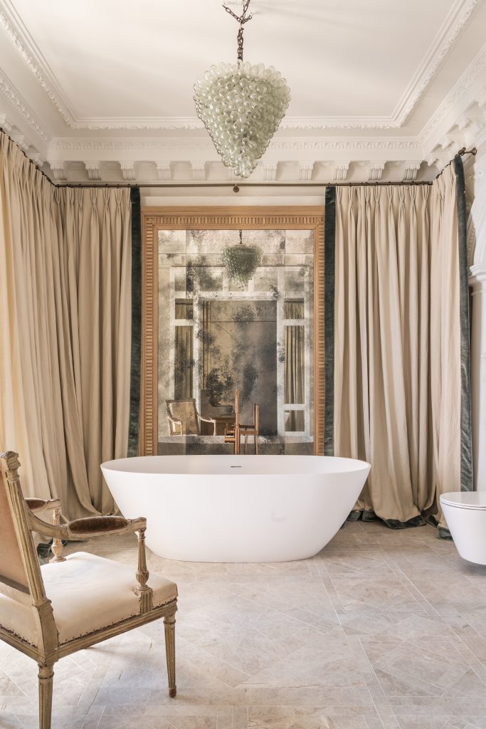 En la zona de la ventana, donde resaltan las vistas a la céntrica calle San Jerónimo y a todo el complejo de Canalejas, se ha reinterpretado un mueble antiguo heredado, como mueble de baño. Sobre él, reposan dos lavabos de encimera redondos en mineral solid de la colección Soller de Strohm Teka, Se complementan con grifería Sense empotrada, tendencia este 2021, en color bronce, de la colección Metallics. Sobre el mueble, dos espejos suspendidos desde el techo como accesorio de la marca.