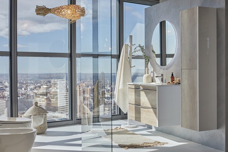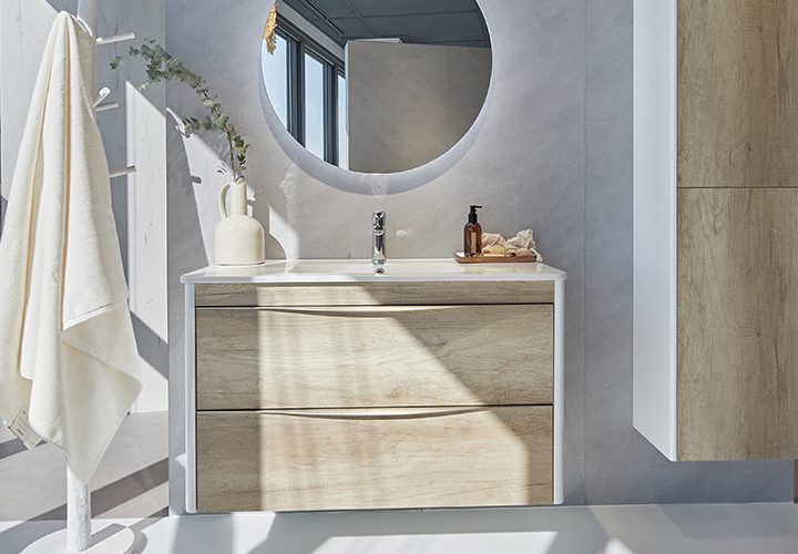 Para crear tu propio paisaje esencial, elige entre los tres acabados de mueble de baño y columna. Combínalas con griferías, lavabos cerámicos y espejos redondos.