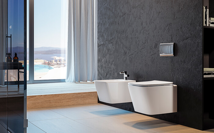 Félnégyzet alakú fali WC-k és bidék kiváló minőségű kerámiából és tisztítást könnyítő belső kialakítással készülnek.